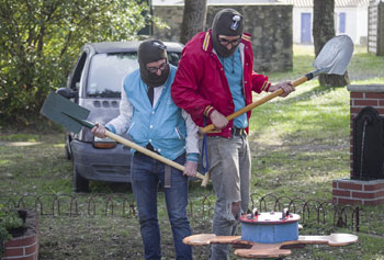 Une voiture rôde puis se gare discrètement devant l'entrée du jardin public. Le silence se fait, le lieu est désert. Deux individus en sortent, repèrent les lieux. Un dernier regard l'un vers l'autre et ils passent à l'action.