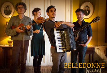 Belledonne rassemble quatre musiciens chanteurs autour de quatre cultures différentes, celles d'Irlande, de Bretagne, des Balkans, et du Mississippi ! Quatre traditions musicales aux atomes crochus, capables d’exprimer intensément les joies et les peines. Ainsi Belledonne se joue des convenances et brouille les pistes en nous mettant tantôt sur les traces d'un Rebetiko perdu en mer, d'une Gwerz déracinée, d'un Blues apatride ou d'une Jig oubliée. Dans cette carte joyeusement étendue, deux violons, un bouzouki et un accordéon se sont mis d'accord pour nous guider.